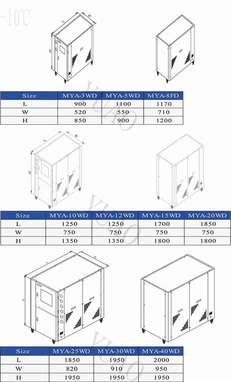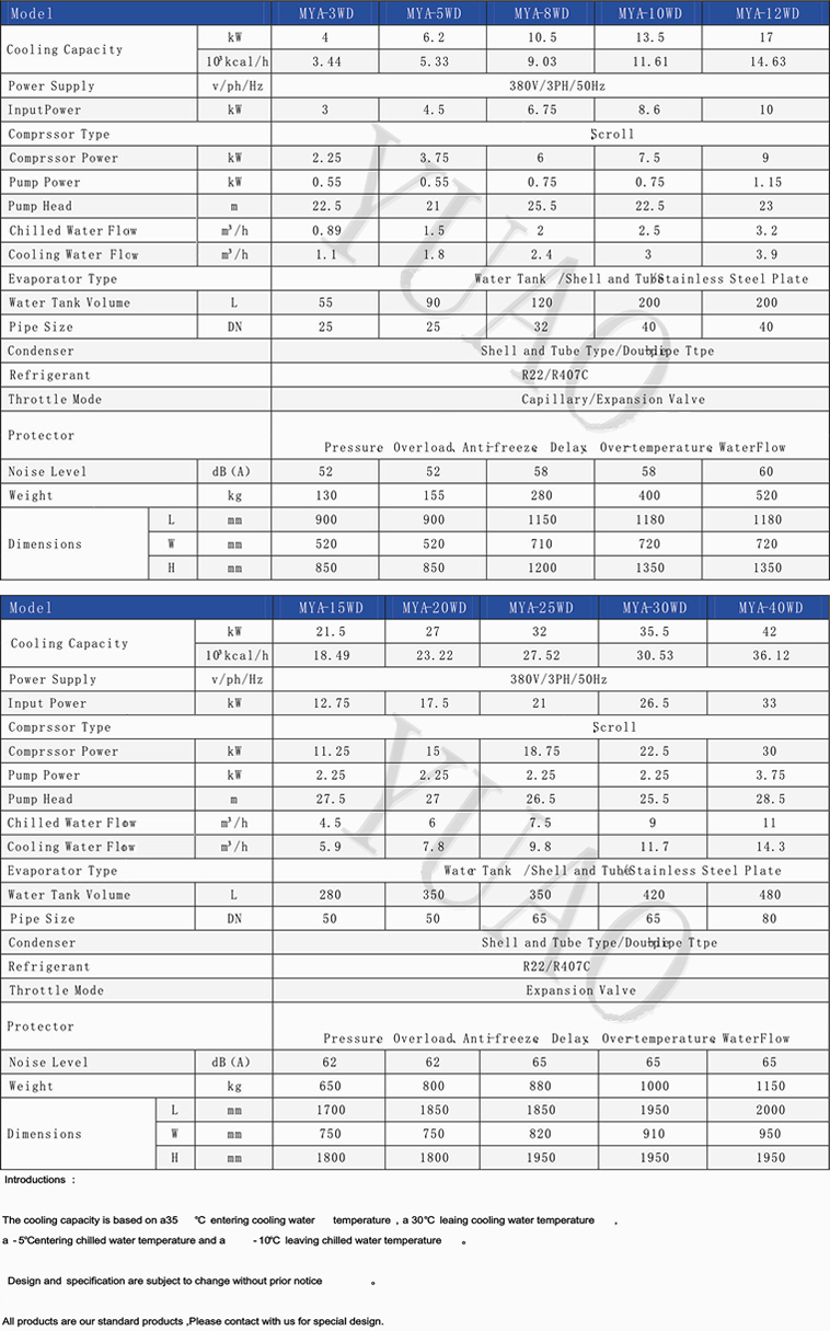 MYA-FD Series of low temperature air-cooled industrial chiller selection of international famous brand "MANEUROP" low-temperature compressor and refrigeration parts,refrigeration control over the use of advanced cutting-edge technology to achieve high energy efficiency,energy saving and environmental protection.This series of low-temperature air-cooled industrial chiller mainly for industrial processes to provide the key to -10℃. contained in the low temperature cooling agent(ethyleneglycol or brine) media,in order to continuously improve the efficiency of industrial production to provide continuous "freezing" Power! |