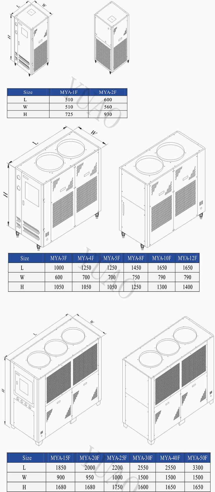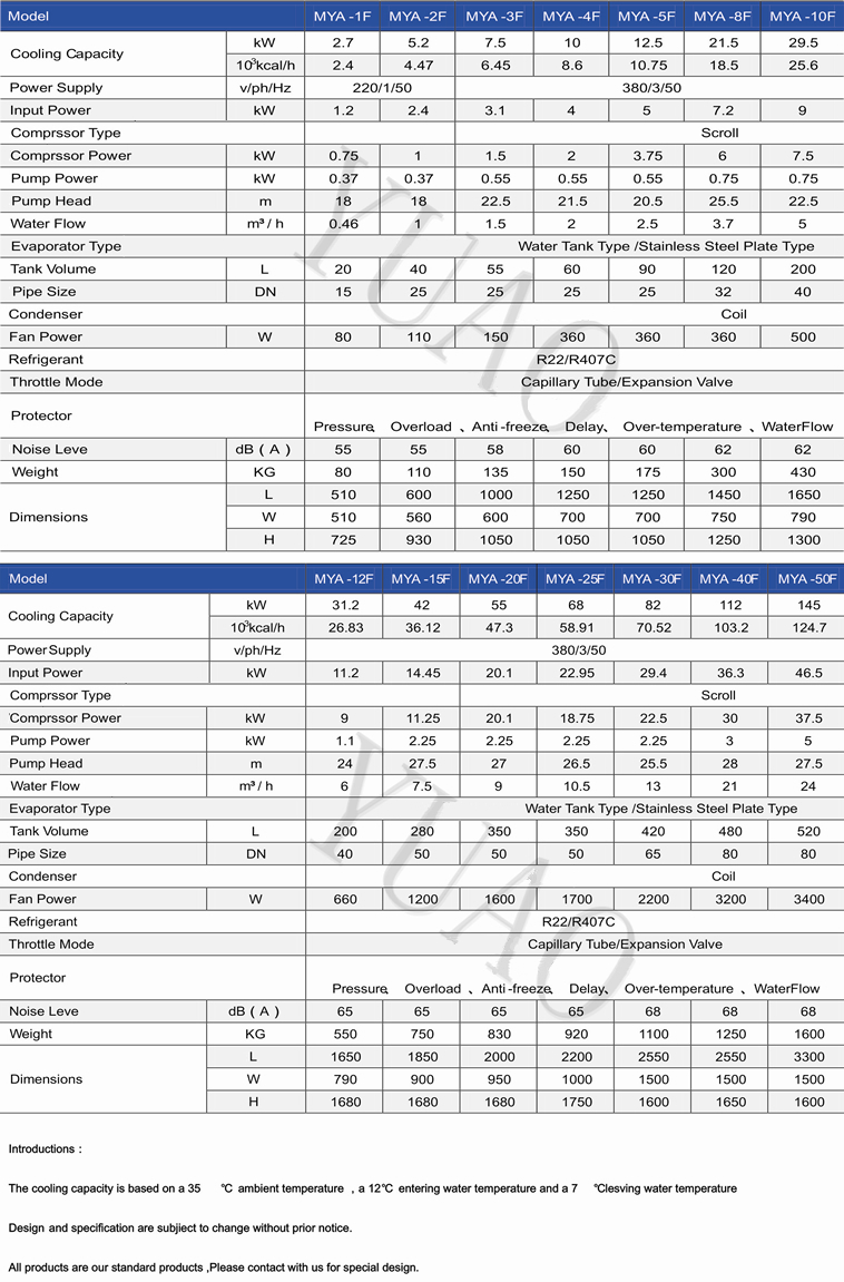 MYA-F Series air-cooled industrial chiller selection of international brands and refrigeration compressor parts,the use of advanced cutting-edge technologies air-conditioning refrigeration controls,to achieve high energy efficiency,energy saving and environmental protection.This series is mainly used in air-colled industiral chiller impurities less dust,water quality,water and other poor or need to save space,the key to industrial production processes for industrial production of high-precision temperature chilled water medium,in order to continuously improve the efficiency of industrial production to provide continuous cooling capacity! |