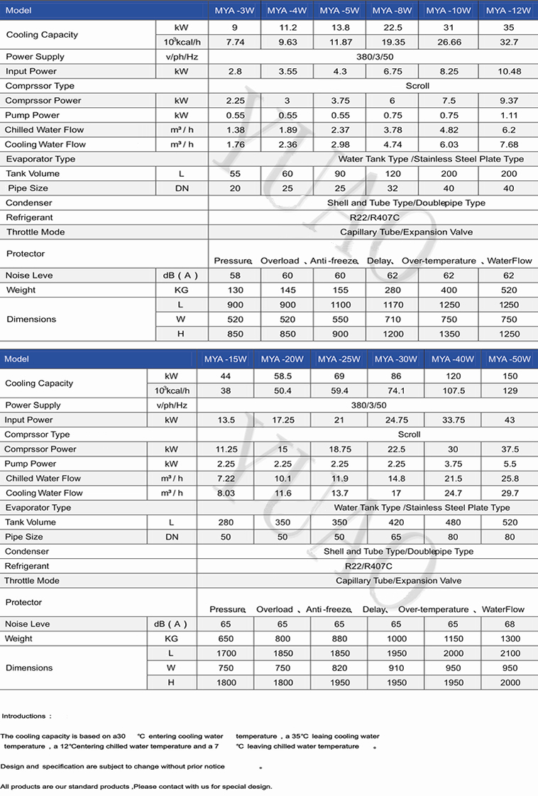 MYA-W Series Water-cooled industrial chiller selection of international brans and refrigeration compressor parts,air-conditioning refrigeration control over the use of advanced cutting-edge technology,to achieve high energy efficiency,energy saving and environmental protection.This series of water-cooled industrial chiller is mainly used in high ambient temperatures,gray dust and more poor ventilation,water-rich large space such as a separate type or a centralized key link in the process of industrial production for industrial production of high-precision temperature chilled water medium,in order to increase efficiency in industrial production to provide continuous cooling capacity!"